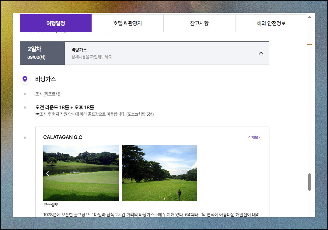 마음에 드는 것을 찾았다면 상세 정보를 꼼꼼히 살펴보세요. 상품을 클릭하면 구체적인 일정표를 확인할 수 있어요. 마닐라 패키지의 경우 로얄 노스우드 C.C에서 라운딩하는 일정이 포함되어 있다는 것을 알 수 있답니다.