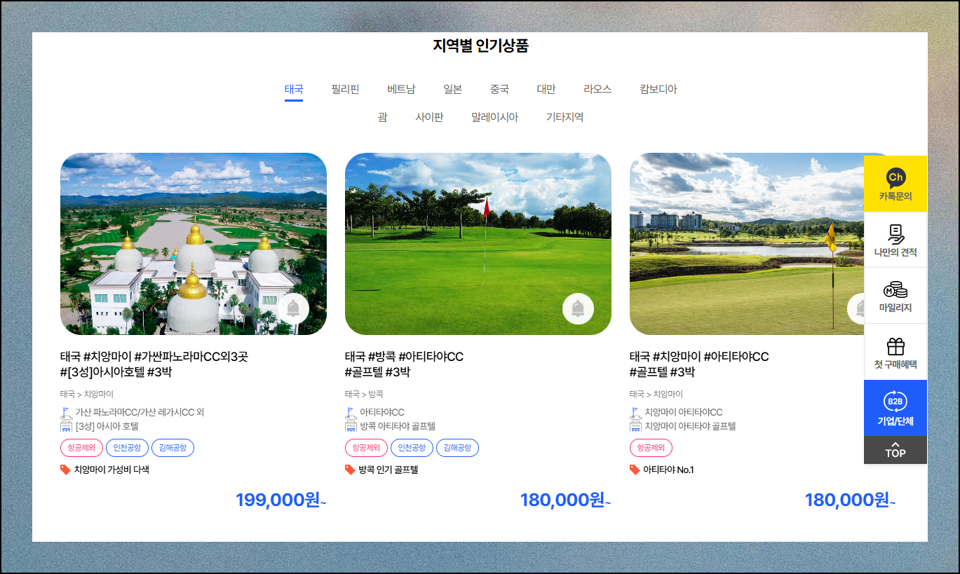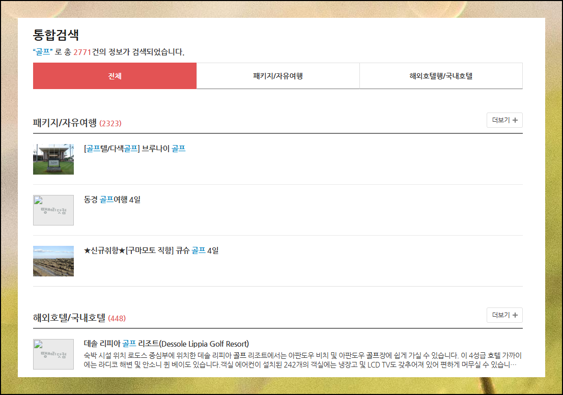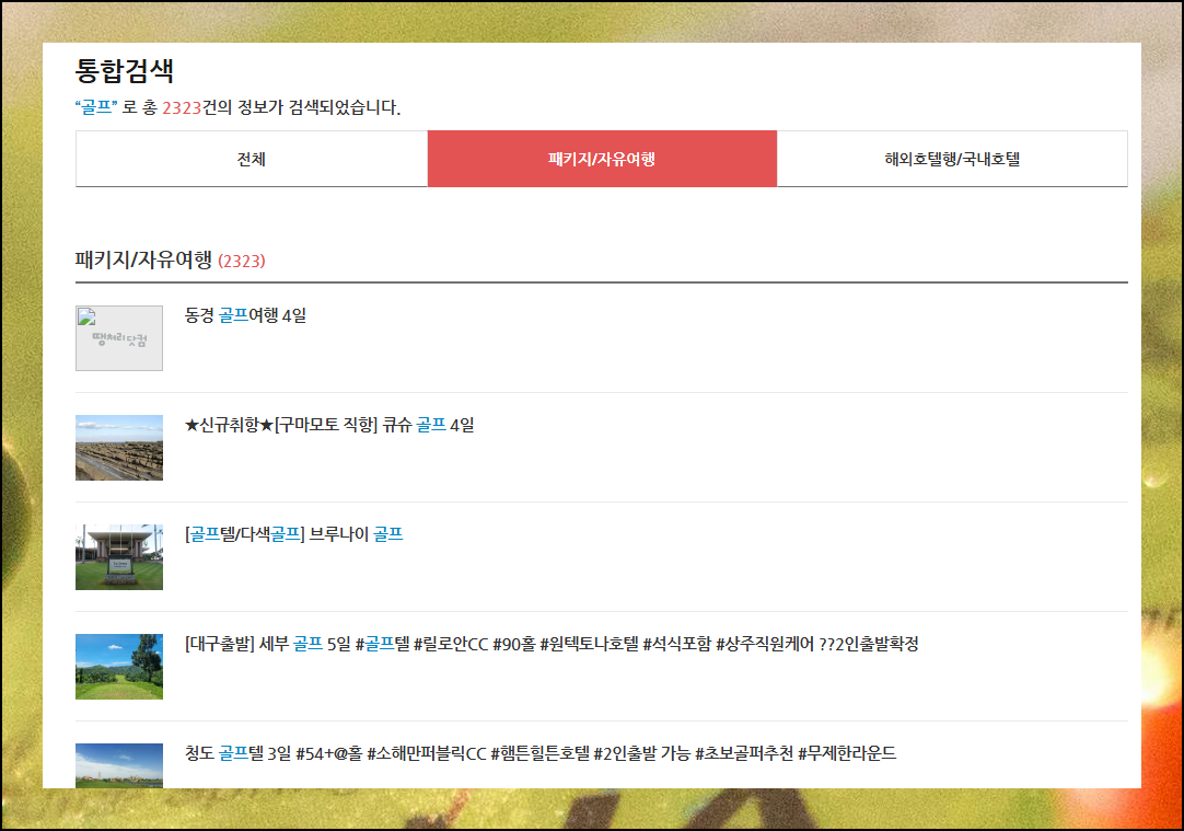 떙처리닷컴의 가장 큰 장점은 다양하다는 것이에요. 항공권부터 해외호텔, 패키지, 자유여행까지 한 곳에서 찾을 수 있어요. 골프 여행을 계획하고 있다면 검색창에 "골프"를 입력하고 엔터키를 누르면 관련 상품이 바로 나타납니다.