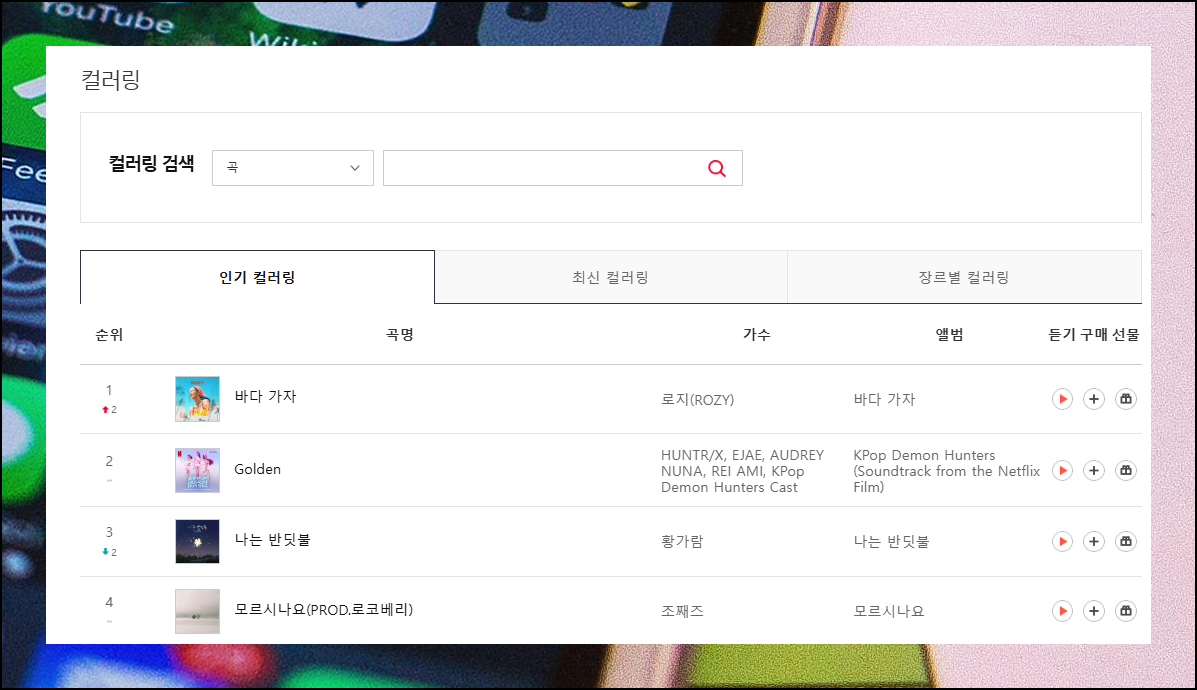 새 페이지에서는 원하는 곡을 직접 검색할 수 있어요. 곡명이나 가수명, 앨범명 중 아는 정보를 입력하면 관련 컬러링 음원이 나타납니다. 검색창 아래쪽에는 인기곡과 최신곡, 장르별 인기곡이 정리되어 있어요. 무료로 미리 들어볼 수 있는 곡들이 정말 많이 준비되어 있습니다.