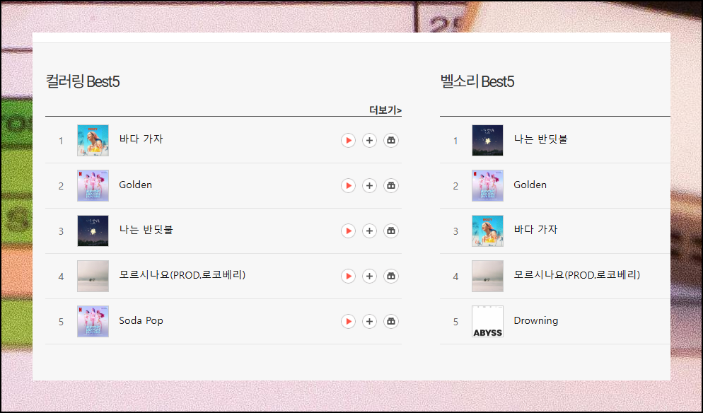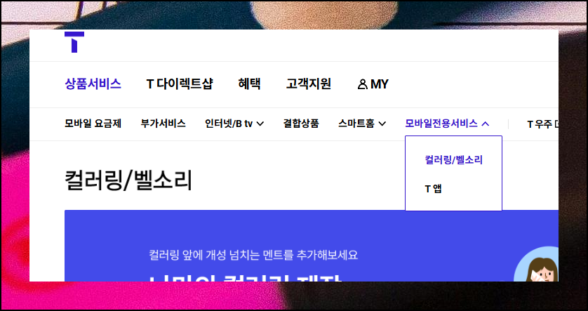티월드 사이트에 접속했다면 상단 메뉴에서 [상품서비스]를 클릭하세요. 그다음 [모바일 전용 서비스]를 선택하고 [컬러링 / 벨소리] 항목을 차례로 눌러주면 됩니다. 화면에는 인기 음원 Best 5가 바로 나타나요. 더 많은 옵션을 보려면 [더보기] 버튼을 활용하세요.