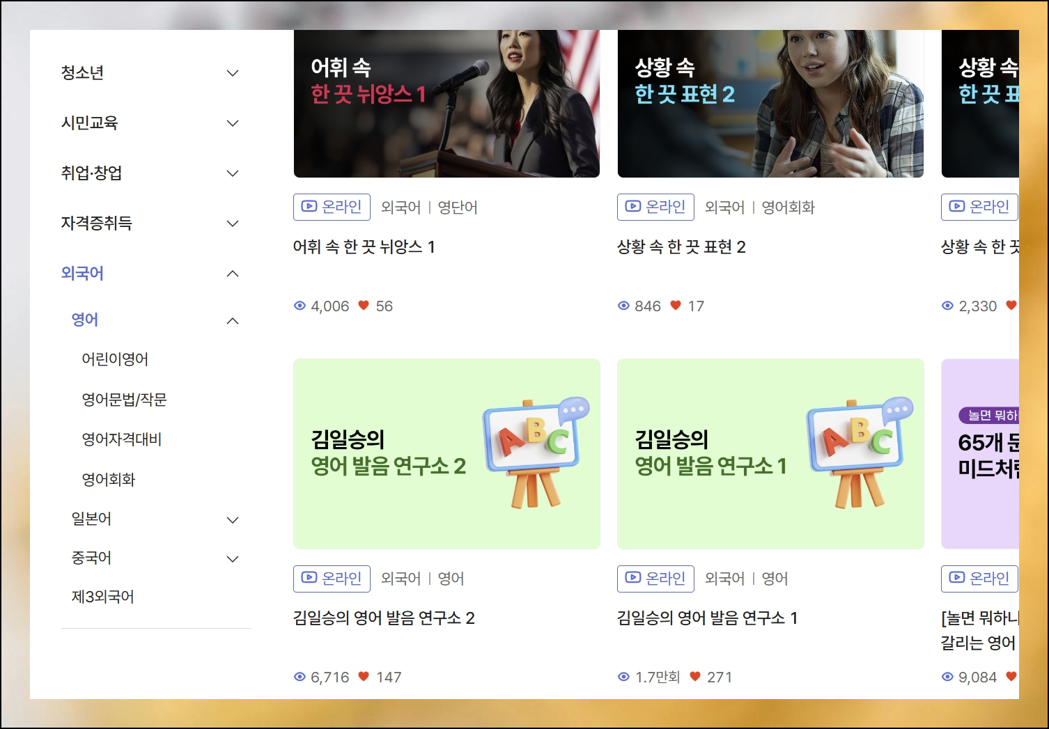 웹사이트에 들어가면 원하는 강의를 쉽게 찾을 수 있도록 메뉴들이 체계적으로 배치되어 있어요. 온라인학습 섹션을 선택하면 주제별로 세분화된 강좌들이 정리되어 있습니다. 외국어 카테고리에서 영어회화 과정을 찾아보는 것이 좋은 방법이에요.
