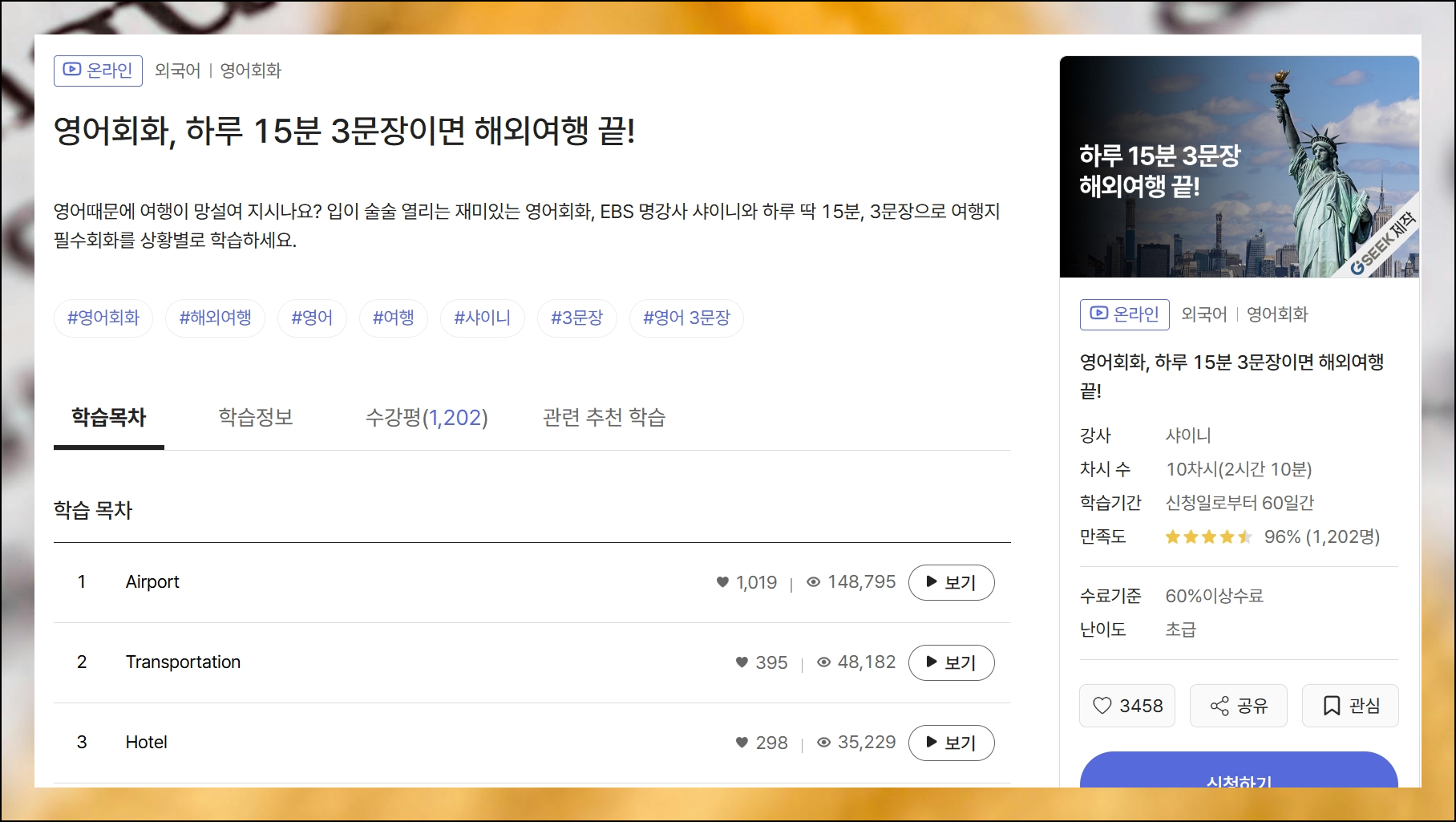 선택한 강좌를 클릭하면 영어회화 교육과 관련된 상세한 정보들을 한눈에 볼 수 있어요. 전체 수업 구성과 총 학습 시간을 사전에 확인할 수 있고, 커리큘럼 내용과 강좌 개요까지 차근차근 검토해보는 것이 좋은 방법이에요. 충분한 정보 수집 후에 학습하기 버튼을 눌러서 본격적인 공부를 시작할 수 있습니다.