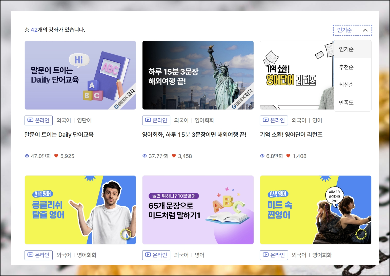 수많은 영어회화 강의 중에서 무엇을 골라야 할지 망설여진다면 인기도 순으로 정렬하는 기능을 써보세요. 화면 오른쪽 위에 있는 정렬 메뉴에서 인기강좌 옵션을 클릭하면 다수의 수강생들이 선택하고 높은 만족도를 보인 콘텐츠들을 우선적으로 확인할 수 있어요. 이미 많은 사람들에게 인정받은 양질의 자료이기 때문에 좋은 방법으로 학습할 수 있습니다.