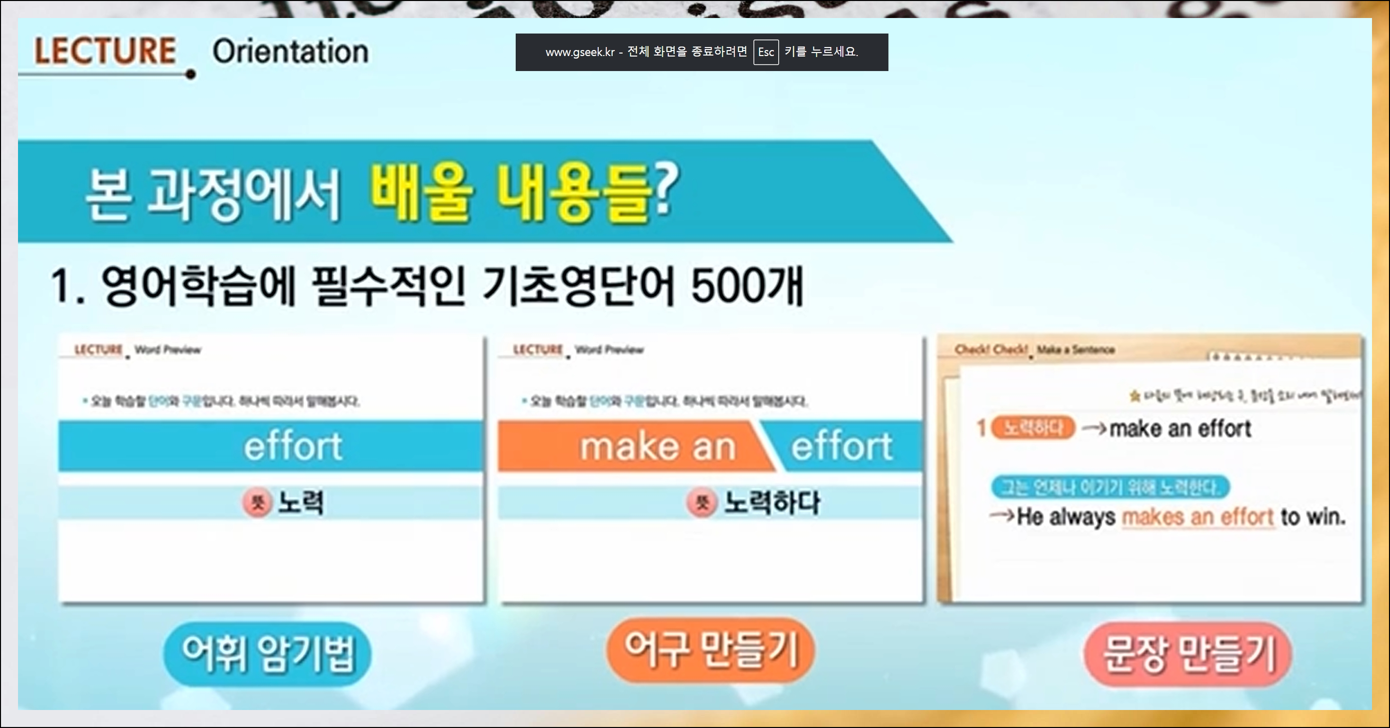 모든 수업을 첫 번째부터 마지막까지 차례대로 완주할 필요는 없어요. 목차에서 필요한 부분만 선별해서 영어회화 공부를 진행할 수 있습니다. 지금 바로 자신에게 최적화된 효율적이고, 체계적인 혼자하기 좋은방법을 찾아 시작해보세요.