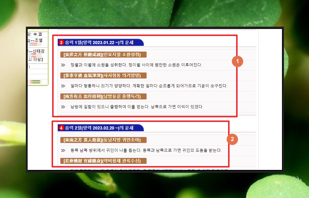 음력을 기준으로 월마다 어떠한 운을 맞게 되는지도 토정비결 서비스를 통해 확인이 가능합니다.