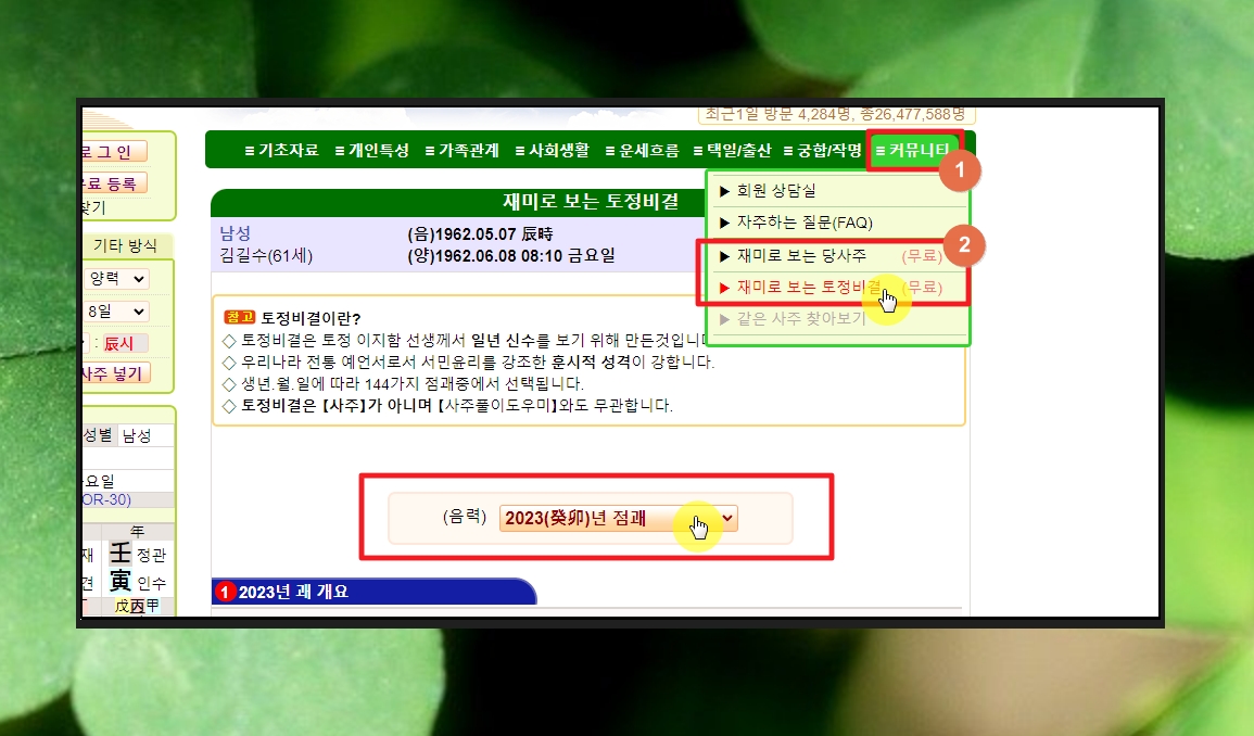 해당 사이트에서 우측 상단에 있는 [커뮤니티] 버튼을 클릭해 주세요. 그럼 무료로 이용할 수 있는 당사주와 토정비결 메뉴가 서비스를 선택할 수 있습니다. 토정비결의 경우에는 올해 2022년에 대한 것은 물론이고, 2024년을 포함한 이후 연도에 대한 나의 토정비결 결과를 확인할 수 있습니다.