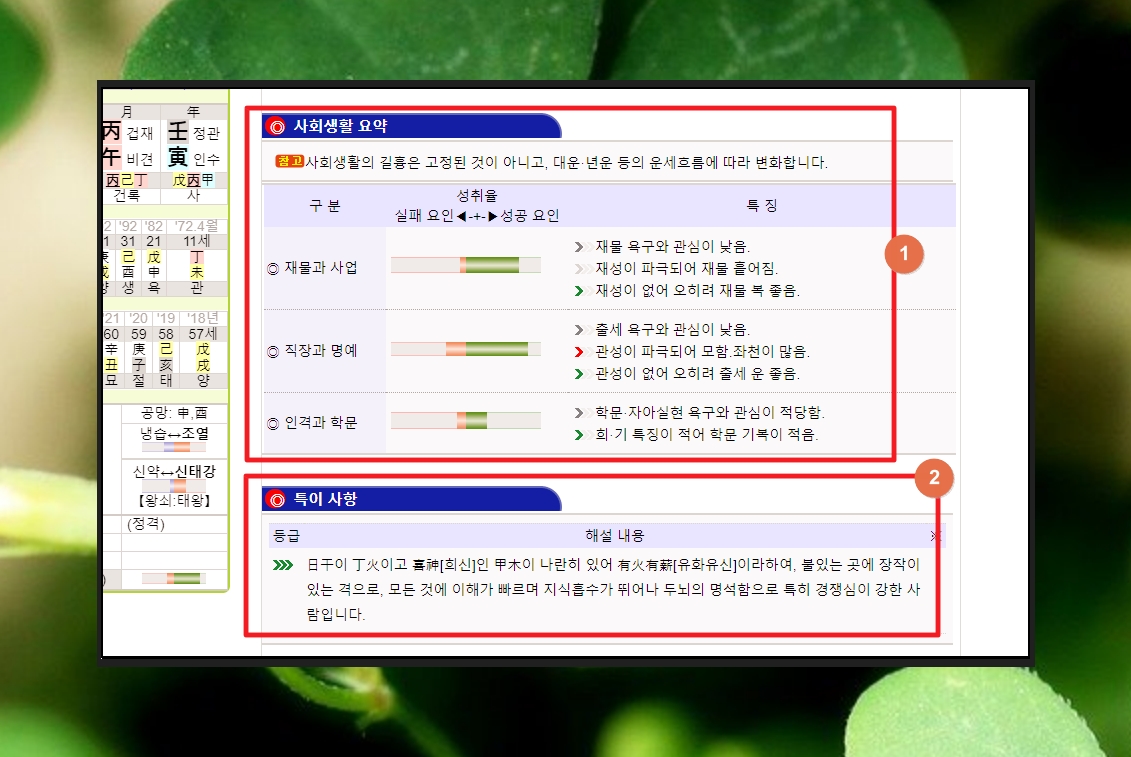 다음으로 재물, 사업, 직장, 명예, 인격, 학문에 관련된 사회생활 부분을 살펴볼 수 있는데요. 사주풀이 도우미의 경우에는 성취율과 특징으로 해석을 해줍니다. 조금 내용이 이해하기 어려운 경우에는 다음 단계에서 이용할 사주풀이 도우미 사이트의 무료 토정비결과 당사주 서비스를 이용해 보세요. 해석이 꽤 상세합니다.