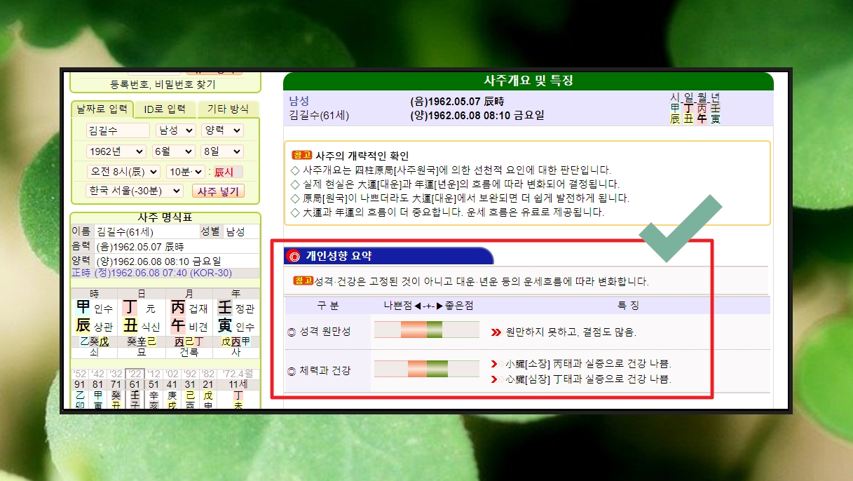 사주풀이 도우미 홈페이지에 접속했습니다. 화면에서 좌측 상단에 보면 태어난 시기에 대한 정보를 입력하는 부분이 있습니다. 여기에 이름, 성별, 생년월일시 등의 내용을 입력해 주세요. 그럼 바로 오른편에는 여러 가지 사주풀이 내용이 나타납니다. 가장 먼저 개인성향에 대한 내용인데요. 성격 원만성과 체력, 건강에 대해 알려주네요.