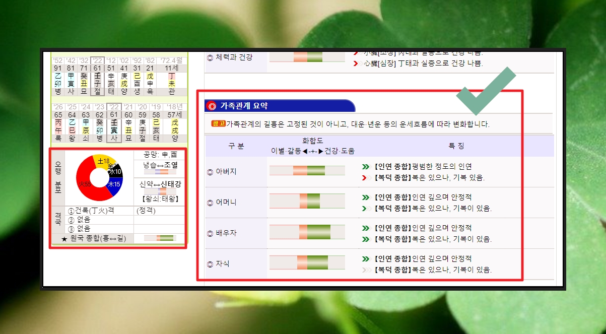 해당 페이지에는 오행 분포가 나타나는데요. 화,토,금,목,수 중에서 나의 오행이 어디에 얼마큼 분포되어 있는지 한눈에 살펴볼 수 있습니다. 바로 우측에는 가족관계에 대한 사주풀이 내용이 나타나는데요. 나와 아버지, 어머니, 배우자, 자식과의 관계를 확인할 수 있습니다.