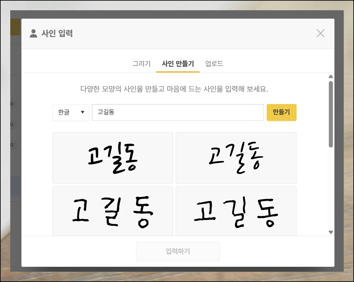 프로그램에서 그리기 기능을 써서 서명을 만들어보겠습니다. 이때는 마우스로 직접 서명을 그려야 해요. 다 그리셨으면 입력하기를 클릭하시면 됩니다.
