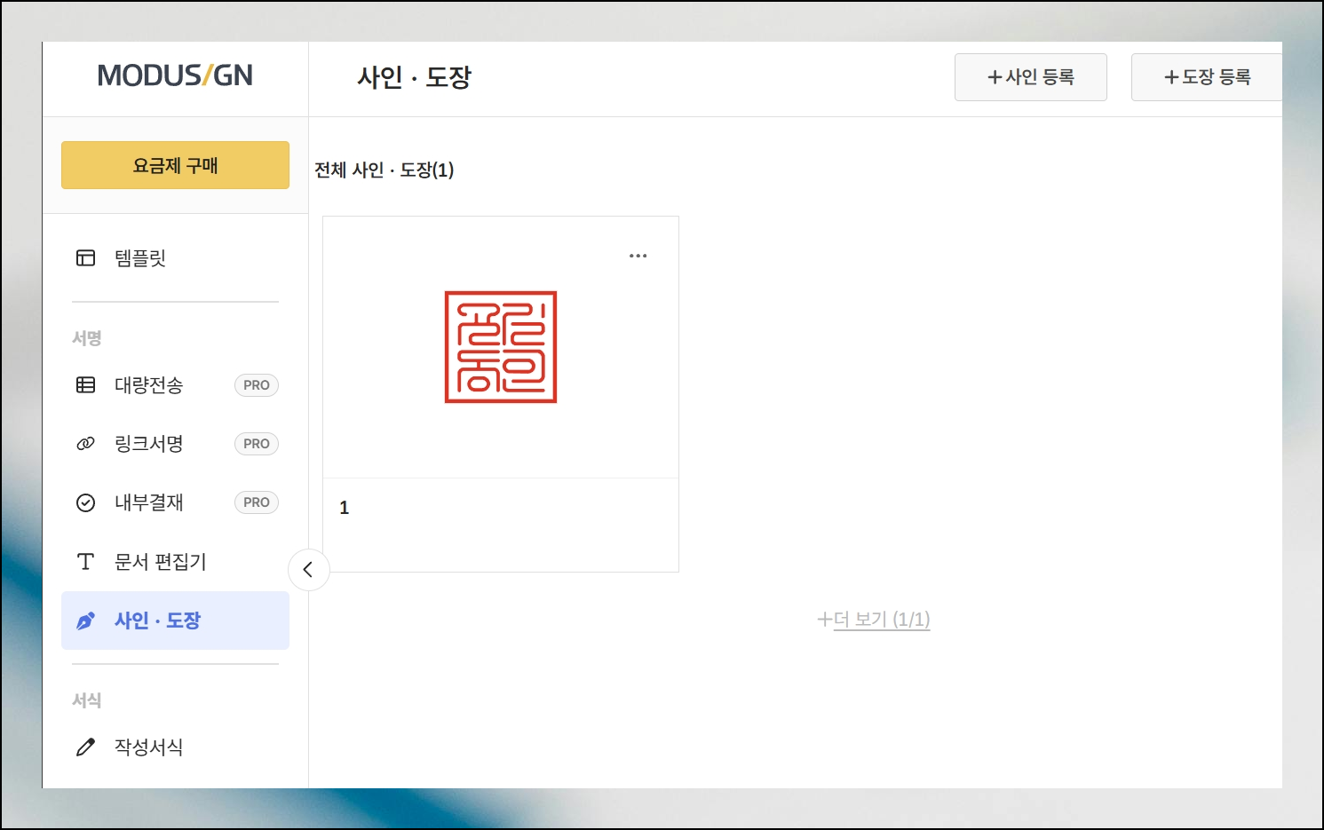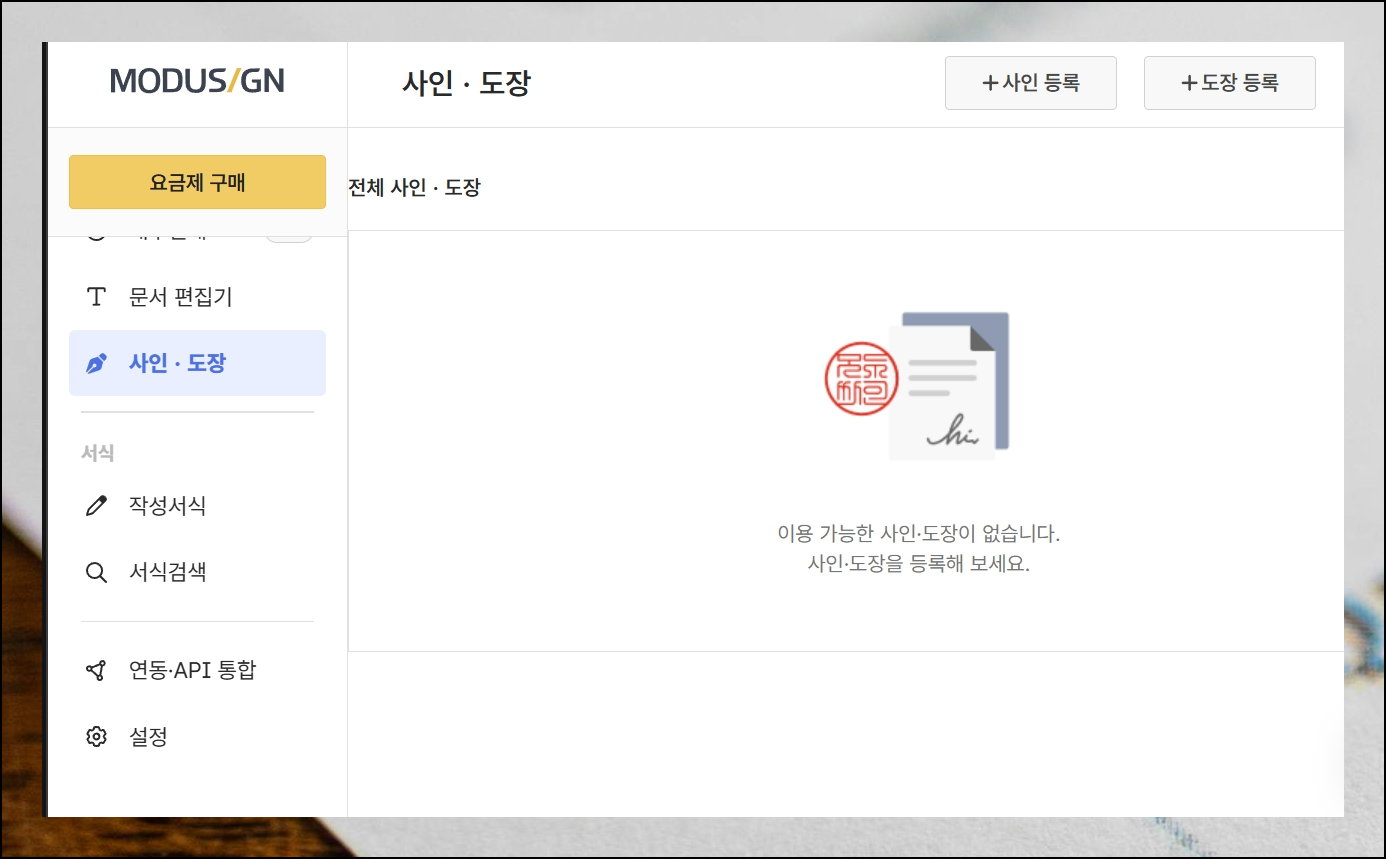 로그인을 마치고 나면 관리 화면으로 이동하게 됩니다. 화면 왼쪽을 보시면 다양한 메뉴 옵션들이 나열되어 있어요. 그 중에서 사인과 도장 항목을 클릭해주세요. 홈페이지 오른쪽 상단의 도장 만들기 버튼을 눌러서 작업을 시작하면 됩니다.