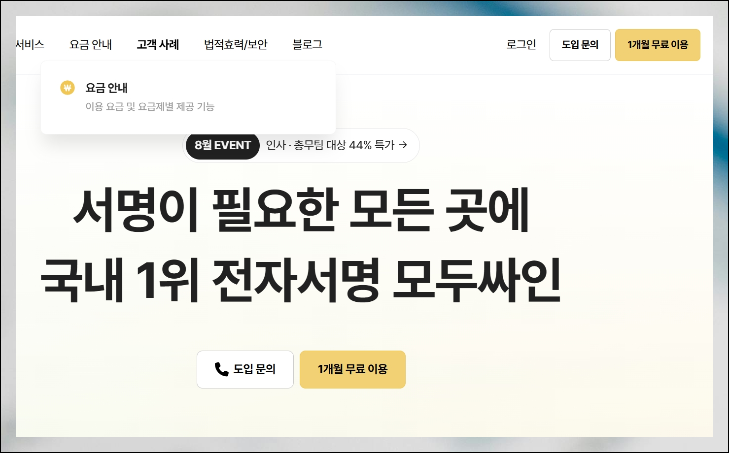 모두싸인 메인 페이지에 들어가시면 오른쪽 위에 로그인 메뉴를 찾을 수 있어요. 이 사이트의 도장 이미지 만들기 기능은 반드시 로그인 후에 사용할 수 있습니다. 가입 절차는 매우 쉽습니다. 아이디와 패스워드, 이메일만 입력하면 1분 만에 계정을 만들 수 있죠.