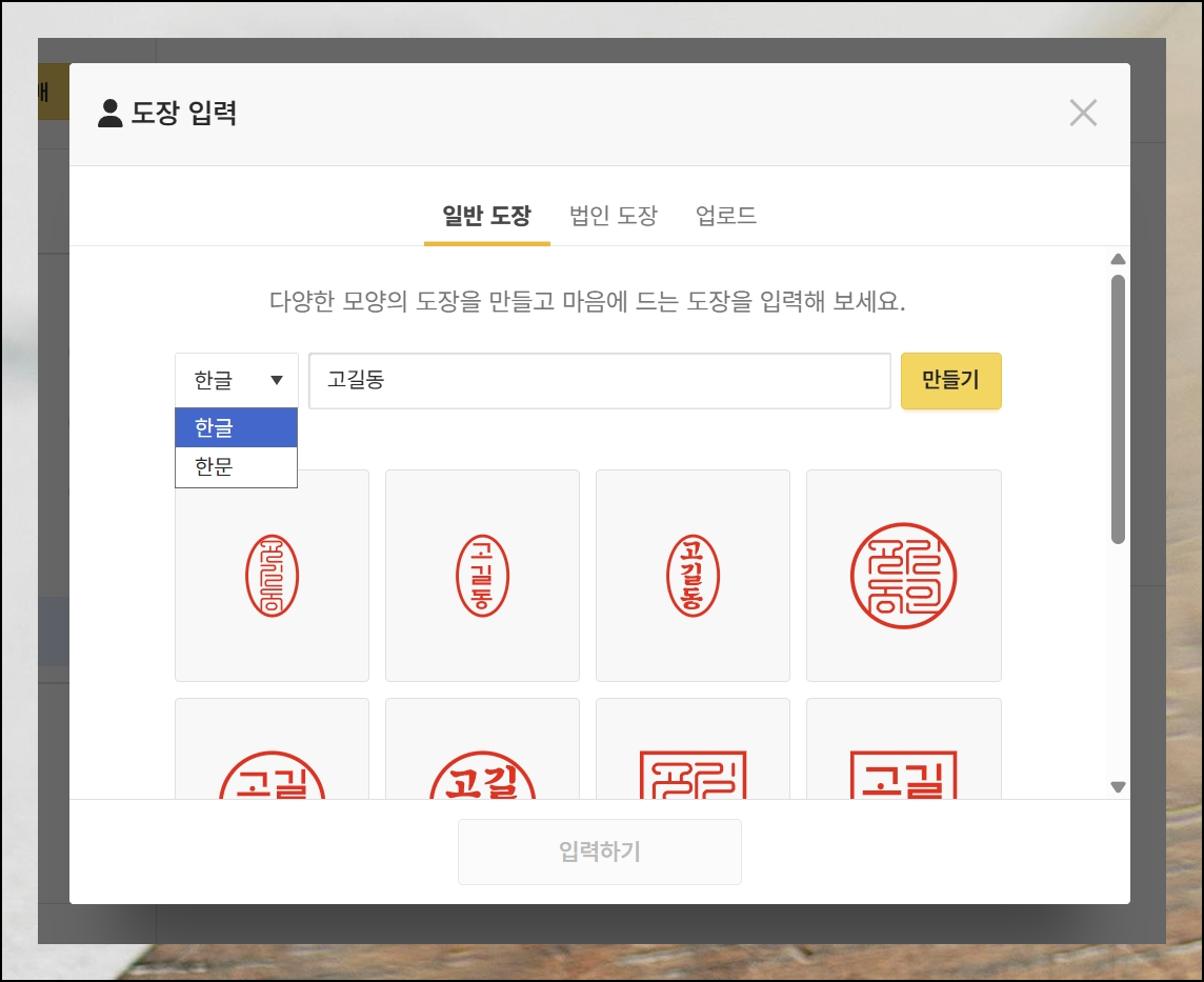 이 사이트에서는 두 종류의 인감을 만들 수 있어요. 일반인용과 법인용으로 나뉘는데, 제작 방법은 똑같습니다. 새길 글자를 한글이나 한자로 타이핑해주세요. 그 다음 만들기를 누르시면 여러 가지 샘플 미리보기가 화면에 뜨게 됩니다.