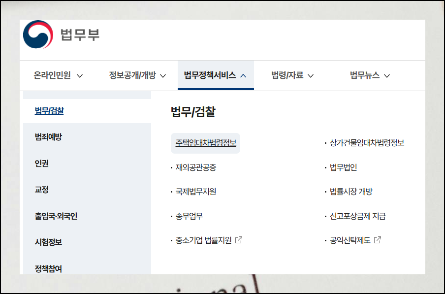 법무부 홈페이지는 각종 법무 서비스와 민원 업무를 처리하는 곳입니다. 메인 화면에서 법무정책서비스 메뉴를 클릭하면 주택 및 상가 임대차 계약서를 작성할 때 사용할 수 있는 무료양식을 다운로드 받을 수 있는 페이지로 이동할 수 있어요. 사용자 친화적인 인터페이스로 설계되어 쉽게 원하는 자료를 찾을 수 있습니다.