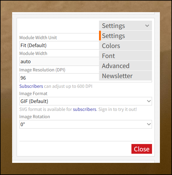 톱니바퀴 버튼을 누르면 코드의 외형을 세부적으로 조정할 수 있어요. 저장될 이미지의 폭과 높이를 원하는 크기로 변경이 가능하고요. 색깔도 취향에 맞게 바꿔보세요. 파일 형식을 다르게 저장하고 싶을 때는 image format 설정을 수정하면 되니까 참고하세요.