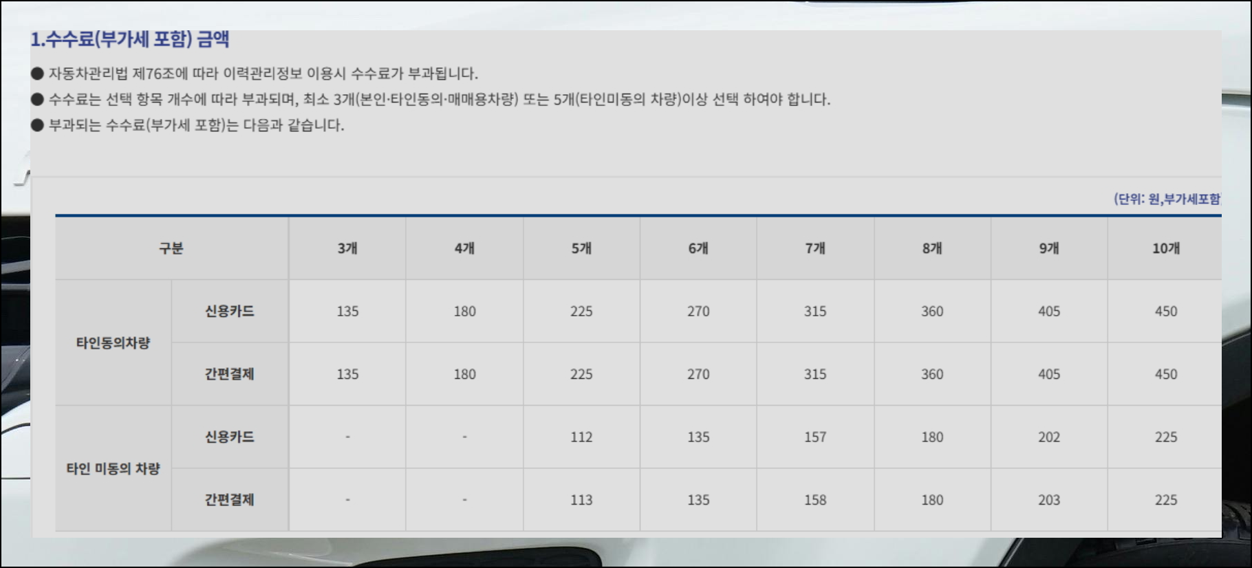 차량 정보를 알아보려면 조회 수수료를 내야 합니다. 차주가 동의했는지 여부에 따라 비용이 달라지는데요. 소유자 승인을 받으면 훨씬 구체적인 사고 정보까지 확인할 수 있어요. 작은 돈으로 큰 피해를 막는 똑똑한 선택이니까 아끼지 마세요.