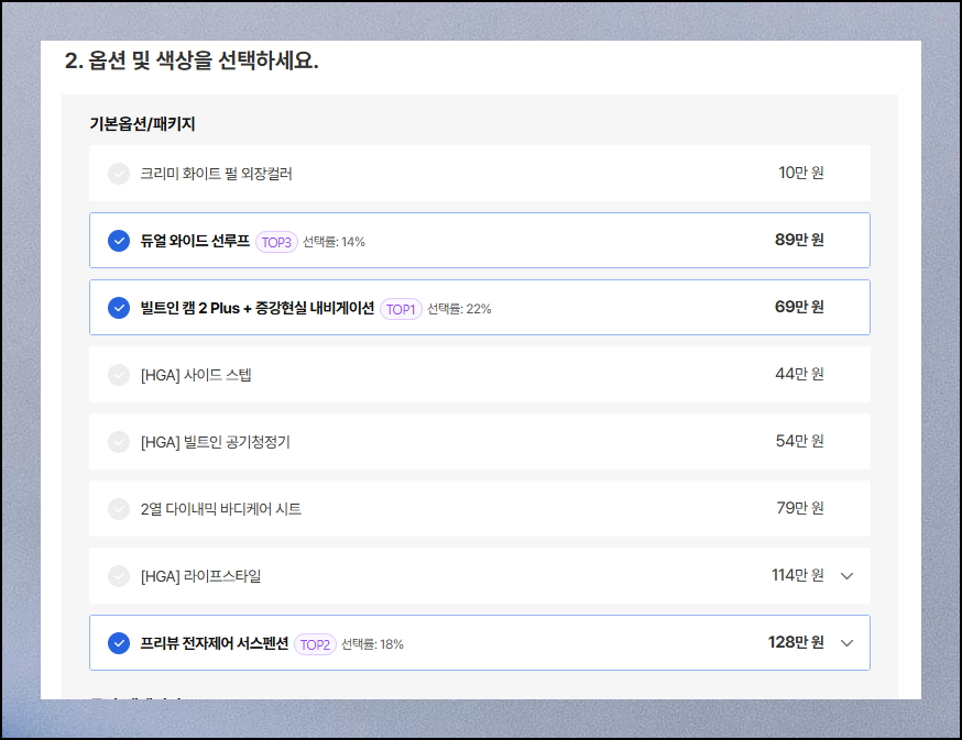 현대자동차의 옵션 명칭만으로는 실제 기능을 이해하기 어려워요. 각 옵션 가격 옆 화살표 아이콘을 클릭하면 상세 기능 설명을 확인할 수 있습니다. 옵션의 필요성을 정확히 판단한 후 선택하는 것이 현명해요.