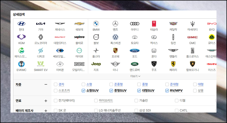 상세 검색 페이지에서 제조업체는 현대자동차로 지정하고, 차종 분류에서 SUV 종류 카테고리를 선택하면 됩니다. 특정 크기의 차량에만 관심이 있다면 소형, 중형, 대형 중 원하는 규모만 선택할 수 있어요.