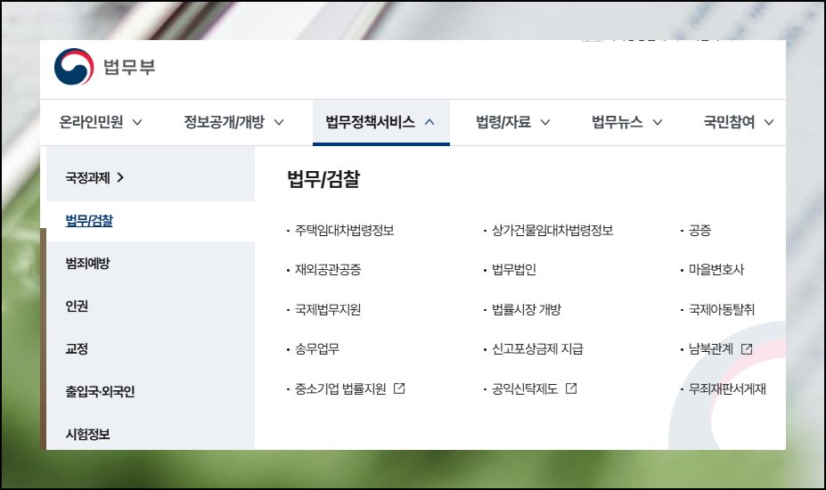 법무부 온라인 플랫폼에서는 다양한 서비스와 참고할 만한 자료를 제공하고 있습니다. 월세 계약서를 찾으시려면 먼저 법무정책서비스 메뉴를 클릭해주세요. 그 후에 법무와 검찰 카테고리를 순서대로 눌러주시면 돼요. 메뉴 배치가 이해하기 편하게 설계되어 있어서 처음 들어오시는 분들도 헤매지 않고 찾아갈 수 있습니다.