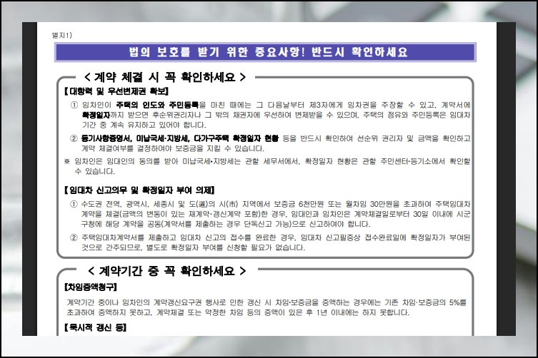 표준 월세 양식의 세 번째 장에는 매우 중요한 사항들이 담겨 있어요. 부동산 계약을 맺는 초기 단계부터 진행 과정, 종료 시점까지 각 구간별로 꼭 살펴봐야 할 체크포인트들이 상세하게 기재되어 있습니다. 해당 내용들을 빠짐없이 확인하시면 훨씬 안전하게 진행할 수 있어요.