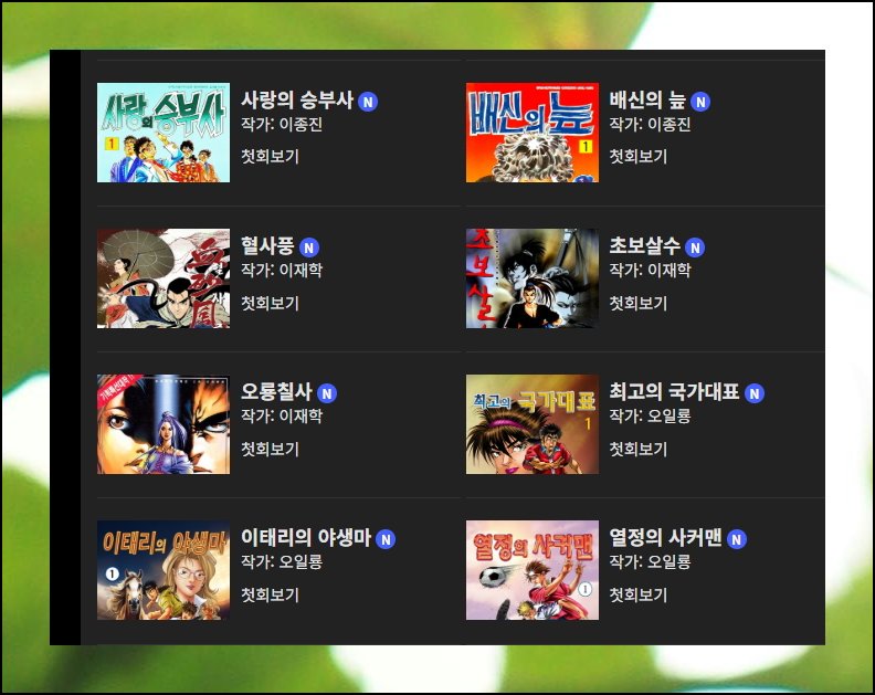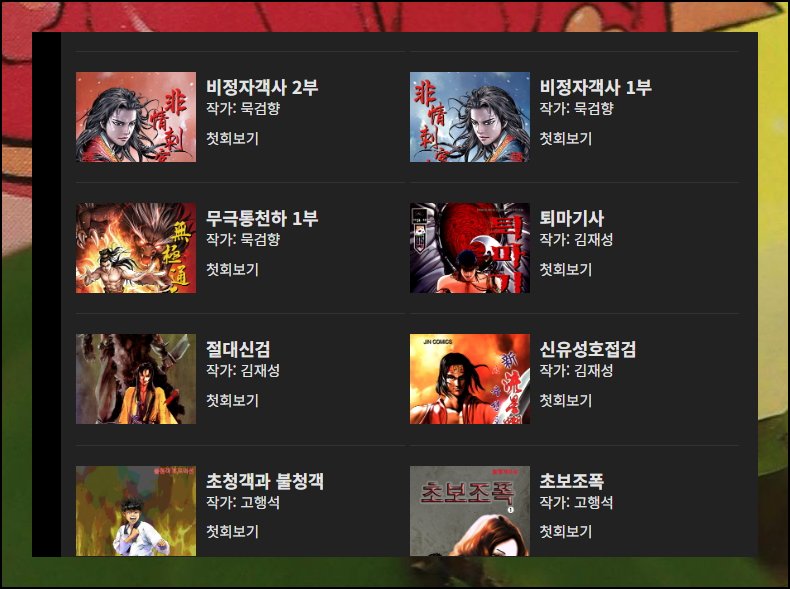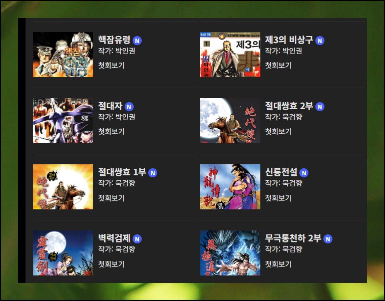 스포츠조선 사이트에 접속한 후 메뉴에서 무료만화 항목을 클릭해 보세요. 최근 인터페이스가 새롭게 개편되었는데요. 겉모습만 봐도 예전과는 확연히 다른 느낌입니다. 과거에는 작가별 카테고리, 프리미엄 섹션 등 여러 구분이 있었어요. 하지만 지금은 모든 작품의 썸네일과 제목을 한눈에 볼 수 있게 바뀌었습니다. 개인적으로는 이렇게 단순해진 디자인이 훨씬 마음에 들어요. 깔끔하잖아요. 참고로 신규 등록된 콘텐츠에는 제목 옆에 N 마크가 표시되니 확인해 보시길 바랍니다.