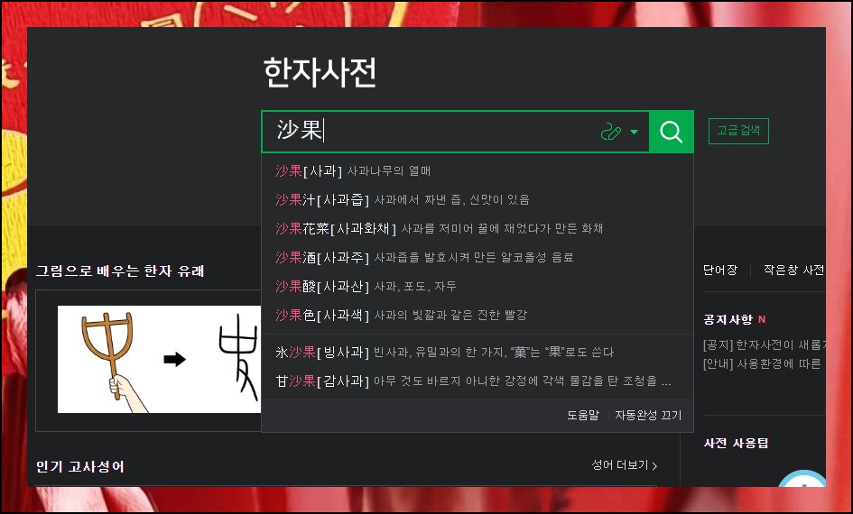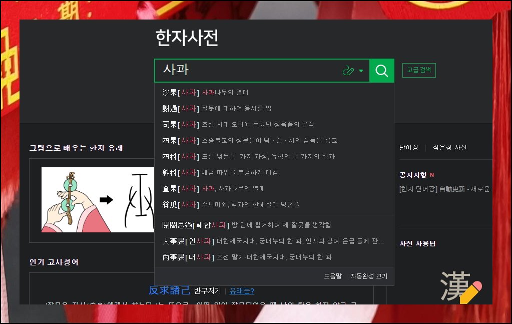 반대로 한자를 입력란에 넣어볼까요. 그러면 그에 해당하는 한글 음과 뜻을 확인할 수 있습니다. 어느 쪽으로든 검색이 가능하다는 점이 실용적이에요.