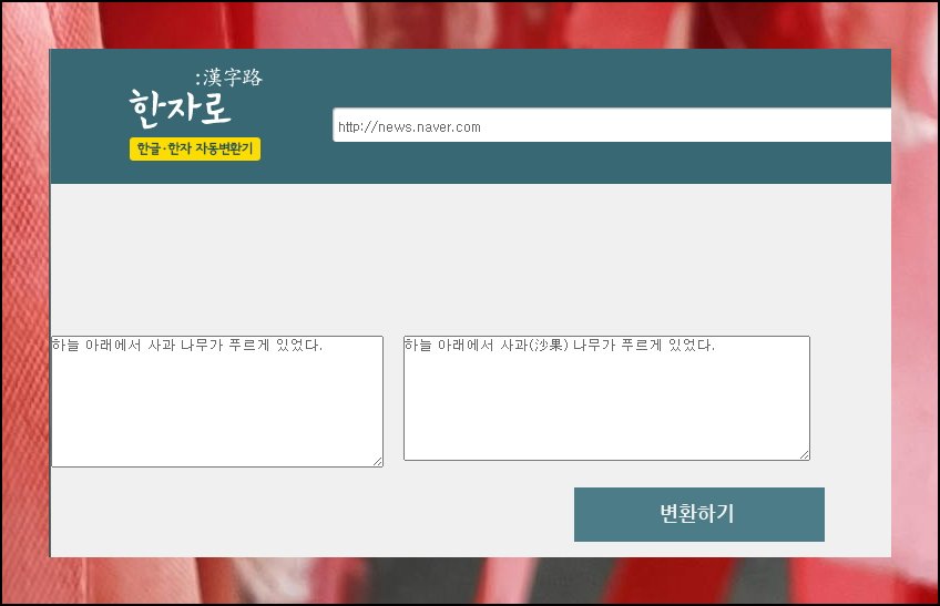 페이지에 들어서면 변환 도구 화면이 눈앞에 펼쳐져요. 왼편 입력란에 바꾸고 싶은 한글 문장을 적어 넣습니다. 이어서 변환하기 버튼을 눌러주세요. 그럼 오른편 공간에 처리된 결과가 표시됩니다. 몇몇 낱말들이 한문 글자로 바뀌어 있는 모습을 볼 수 있어요.