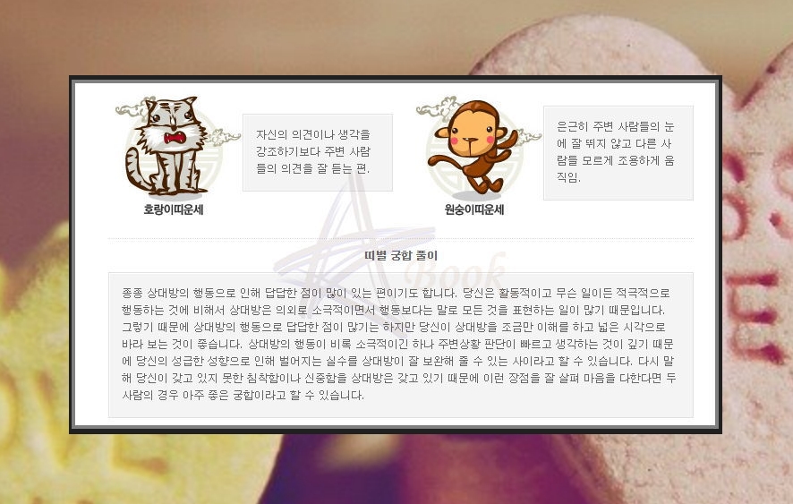 두번째는 서로의 띠를 가지고 테스트를 하는 것인데요. 호랑이띠와 원숭이띠는 좋다고 합니다. 띠를 가지고 보면 꽤 냉정한 결과가 나오는 편인데요. 왜냐하면 맞는 띠와 맞지 않는 띠가 뚜렷하게 구분되어 있기 때문입니다.