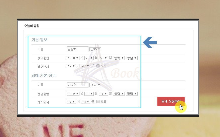 접속한 사이트에서 상대방과 본인의 이름, 생년월일, 태어난시를 적고 '운세 신청하기' 버튼을 눌러주세요. 혹시 태어난시를 모른다면 '모름'에 체크하시면 됩니다.
