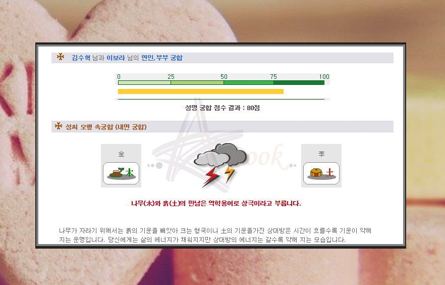 점수와 내면궁합부터 시작하는데요. 오행을 기반으로 보면 나무와 흙은 상극이라고 하는데요. 사이트에 나오는 풀이를 통해 쉽게 이해하실 수 있습니다.