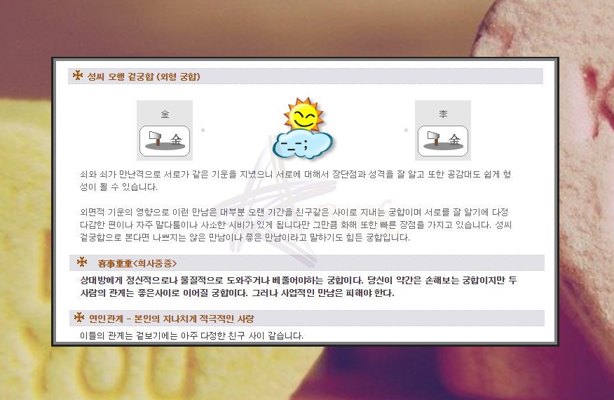그 외에 외형 궁합과 희사중중, 관계에 대한 해석 등의 풀이를 보실 수 있는데요. 평소에 궁금한 점에 대한 답을 얻으실 수 있습니다.