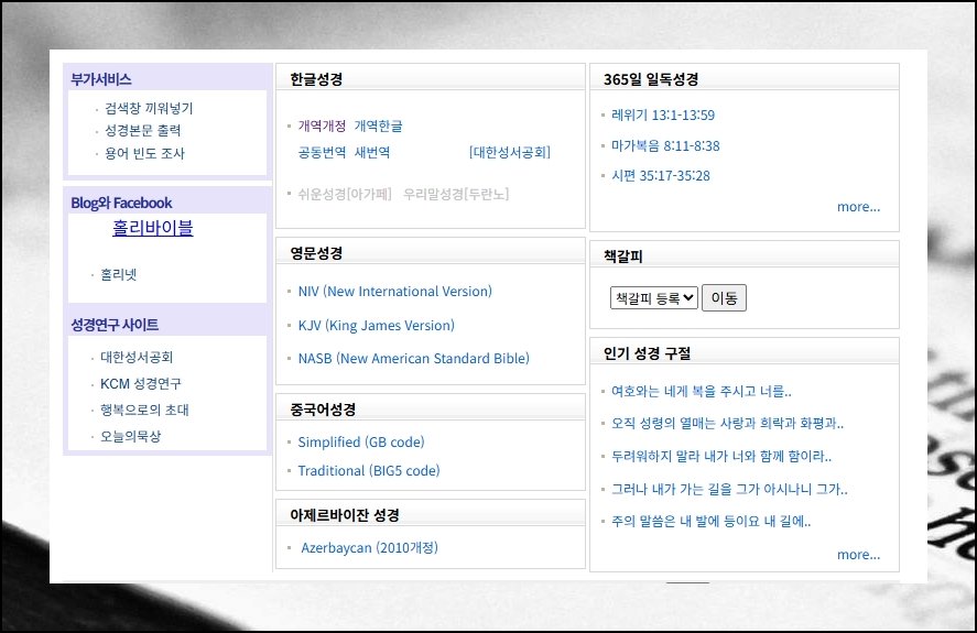 holybible 사이트를 방문하면 국문과 영문 성경을 나란히 살펴볼 수 있어요. 개역개정, 개역한글, 공동번역, 새번역처럼 폭넓은 역본이 무료로 준비되어 있습니다.
