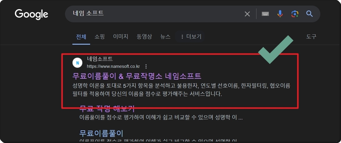 그럼 프로그램을 통해 어떻게 이름을 무료로 얻는지 알려드릴게요. 일단 프로그램을 이용할 수 있는 사이트에 접속해야 하는데요. 이번에 이용할 사이트는 "네임소프트"에요. 이곳에서 성명에 대한 풀이도 무료로 받아볼 수 있죠.