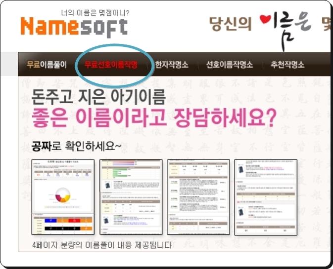 사이트에 접속하면 두 번째 메뉴인 "무료 선호 이름 작명"을 선택합니다. 바로 아래에 "공짜" 표시가 되어 있는 것을 확인할 수 있어요. 무료로 이용할 수 있는 서비스를 제공한다는 의미죠.
