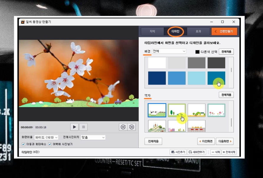 이번에는 디자인 입니다. 배경과 액자 부분을 내 마음대로 꾸밀 수 있는데요. 기본으로 제공되고 있는 템플릿을 선택하기만 하면 되기 때문에 편리하게 배경과 액자를 꾸밀 수 있습니다.