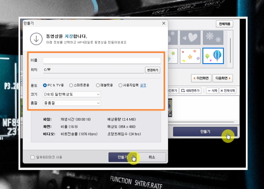 상세 꾸미기 단계까지 완료를 하였다면 프로그램 화면에서 우측 하단에 있는 [만들기] 버튼을 클릭해 주세요. 그럼 우리가 만든 작품을 비디오 파일로 변환할 수 있습니다. 이름, 위치, 용도, 크기, 품질 항목에 알맞은 값을 입력한 후 [만들기] 버튼을 누르면 돼요.