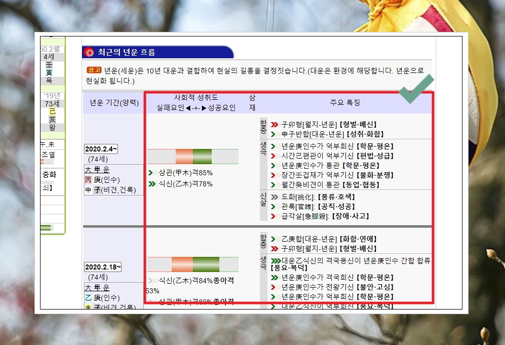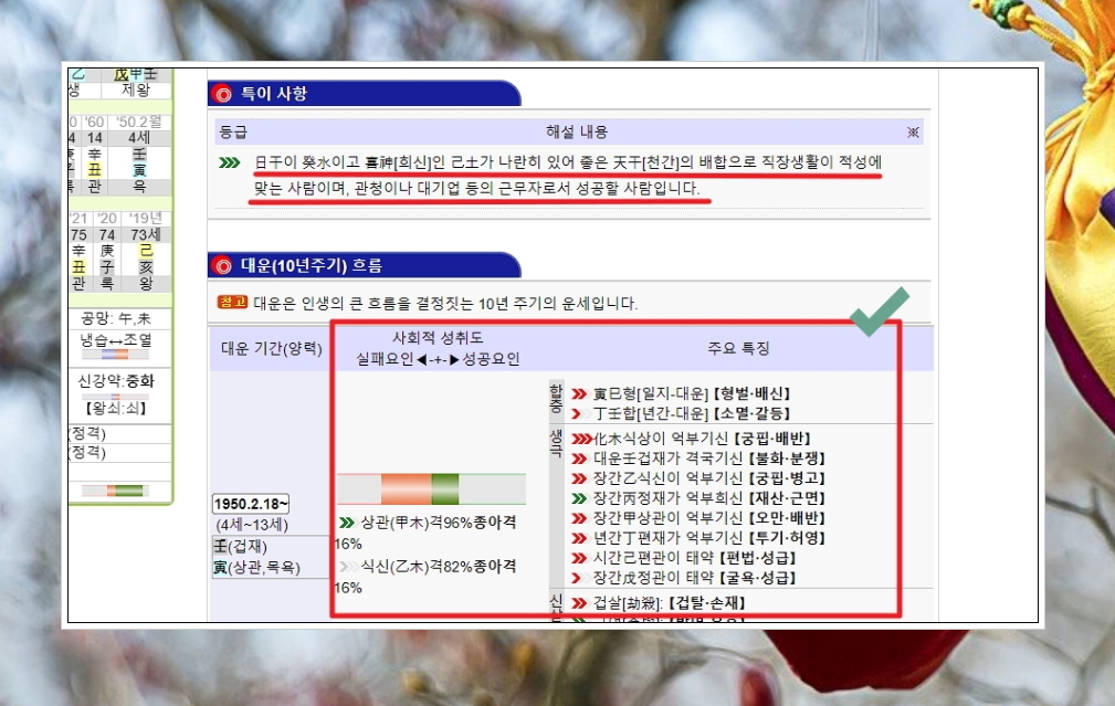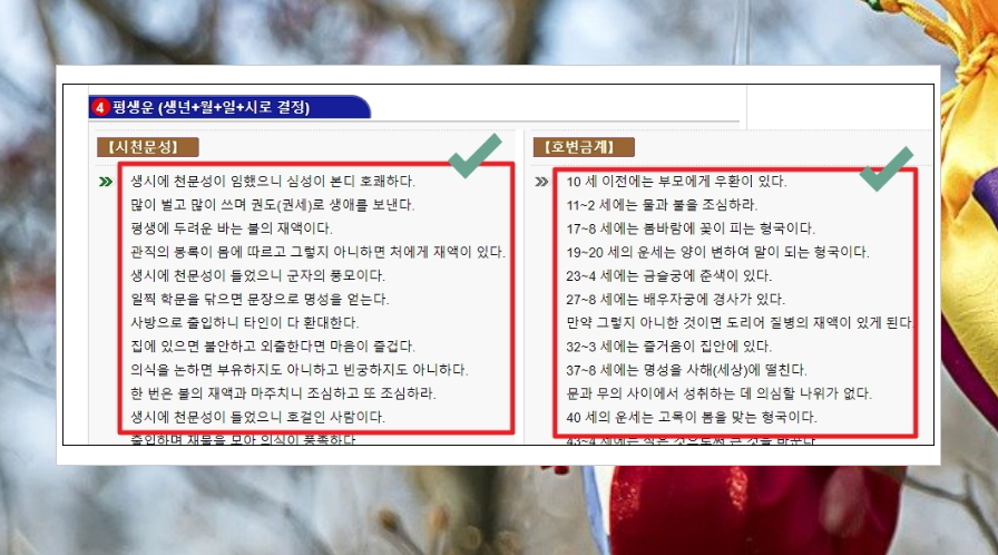 평생운은 태어나면서부터 생을 다할때까지 들어오는 운이나 일어나는 사건에 대해 알려주는데요. 나이대에 따라 어떤 일이 있는지 직접적으로 알려줍니다. 무조건 맞는 것은 아니지만, 재미로 보기에는 정말 좋습니다.