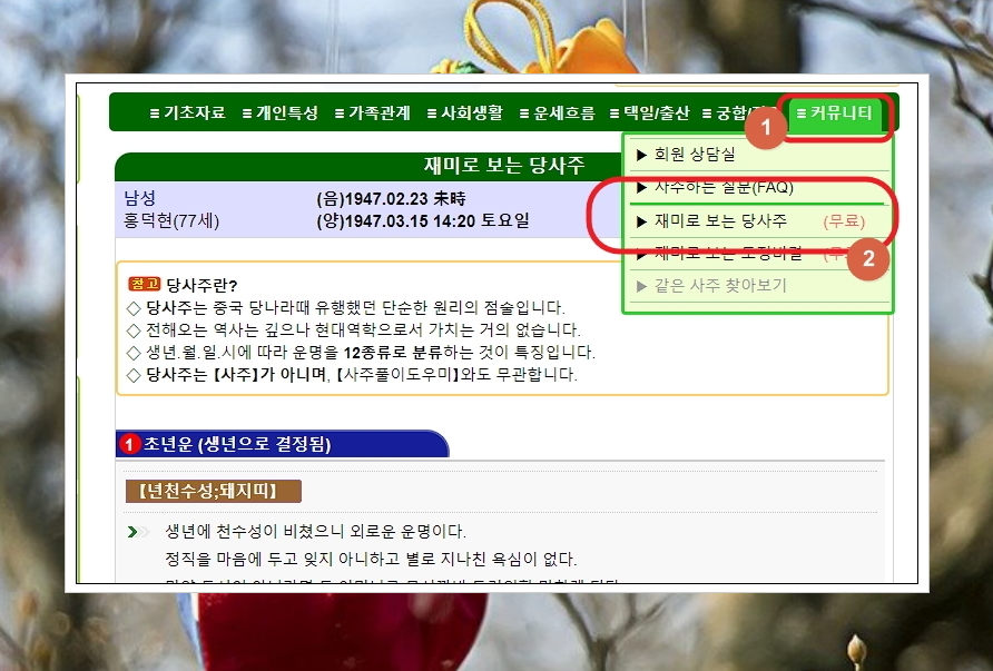 지금까지 인터넷 사이트를 통해 무료 만세력을 보는법을 상세히 설명 드렸는데요. 앞서 언급한 바와 같이 상세한 평생운 풀이를 보는 법을 같이 알려드리겠습니다. 메뉴에 있는 [재미로 보는 당사주]를 선택해 주세요. 화면에 표시된 것과 같이 해당 역술 또한 인터넷 사이트를 통해 무료 이용이 가능합니다.