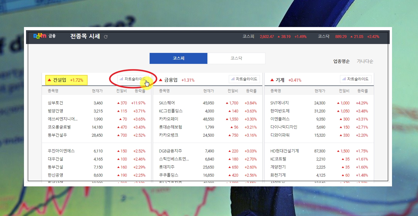 3. 제가 앞서 언급한 실시간으로 주식시세를 알아보기에 좋은 서비스가 나타났습니다. 코스피와 코스닥에 속하는 전종목에 대하여 주식시세를 대량으로 확인할 수 있는 곳인데요. 같은 업종끼리 묶어 놓아서 업종별 주식 흐름을 파악하는데도 용이합니다. 업종 지수를 확인해 보고, 관심 있는 업종 옆에 있는 차트 슬라이드를 선택해 보세요.