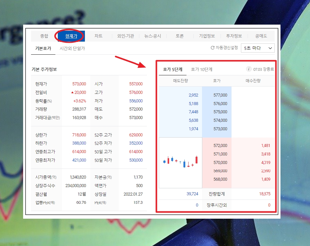 7. 시세를 집중적으로 확인해 보고 싶다면 현재가 메뉴를 선택해 보세요. 호가창까지 확인이 가능합니다. 5초 마다 실시간으로 갱신되는 것을 확인할 수 있어요.