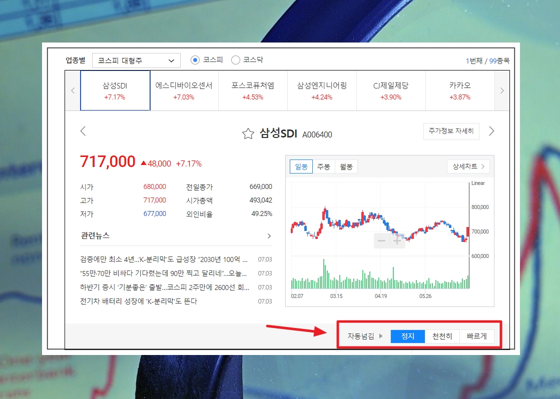 4. 차트슬라이드 페이지가 열렸습니다. 여기에서는 우리가 선택한 업종에 속한 전종목에 대한 실시간 주식 시세를 확인할 수 있습니다. 자동 넘김 기능을 이용하면 실시간으로 계속 여러 종목에 대하여 손쉽게 가격 정보를 살펴볼 수가 있습니다. 특정 업종에 관심이 많은 경우에 활용하면 정말 좋아요. 추가적으로 실시간으로 나오는 뉴스도 확인할 수 있죠.