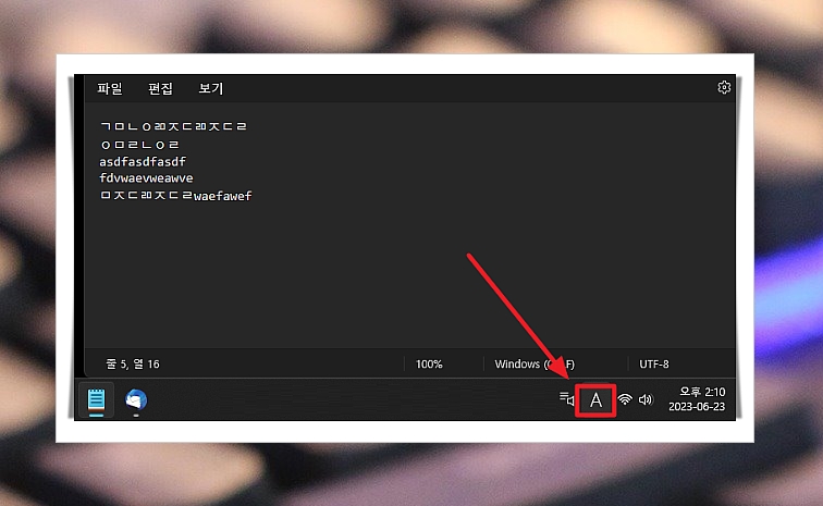 2. 혹시 한영전환이 제대로 안되는 경우라면 작업표시줄에 있는 "A" 또는 "가"를 클릭해 보세요. 그 다음 메모장에 키보드 입력을 해보세요. 이것으로 해결이 안된다면 드라이버 쪽에 문제가 있을 수 있는데요. 다음 단계를 진행해 주세요.