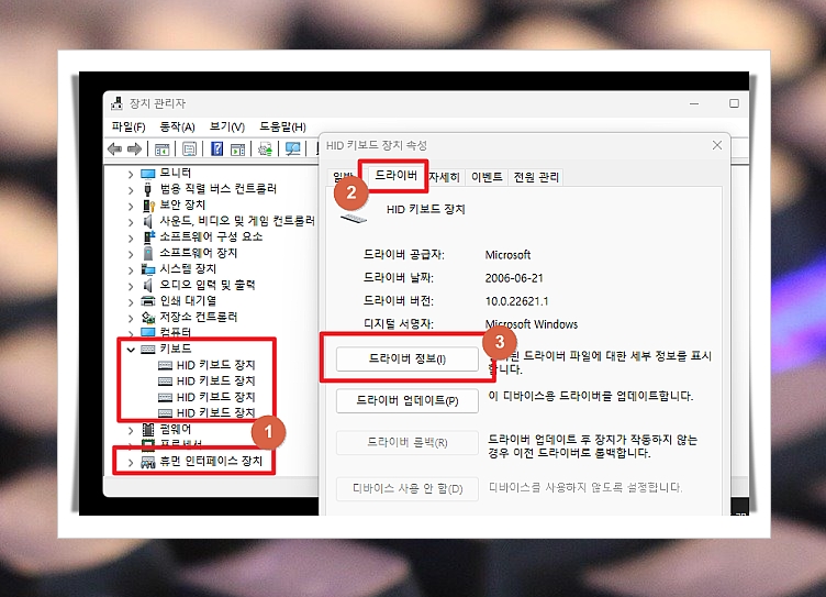 5. 키보드 카테고리 또는 휴먼 인터페이스 장치를 열어 본인이 사용하는 장치를 찾아주세요. 그 다음 마우스로 더블 클릭합니다. 그럼 선택한 장치에 대한 속성 창이 열리는데요. 여기에서 드라이버 탭을 선택한 다음 "드라이버 업데이트" 버튼을 눌러주세요.