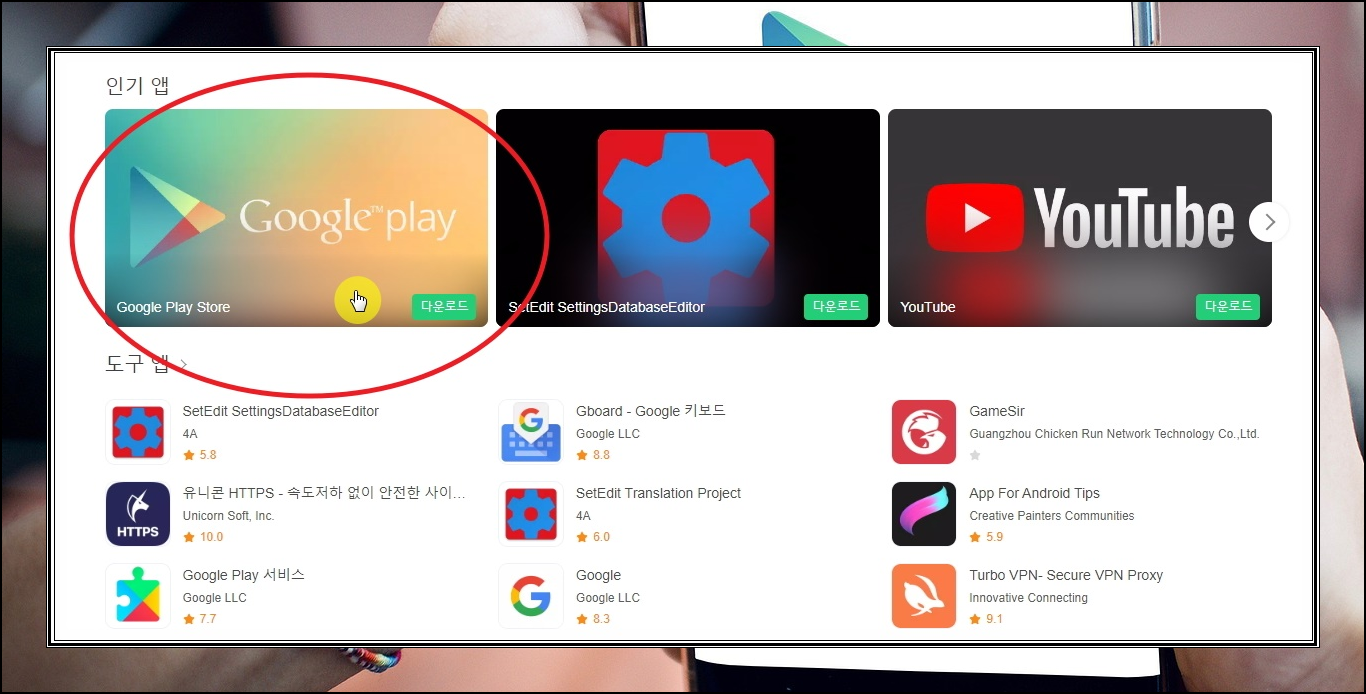 3. 새롭게 열린 페이지에서 보면 인기의 시리즈 중에서 첫 번째 구글 play스토어가 있습니다. 해당 부분을 클릭해 주세요. 참고로 유튜브나 게임, G보드 등 대부분의 어플리케이션을 이곳에서 다운 받을 수 있습니다.