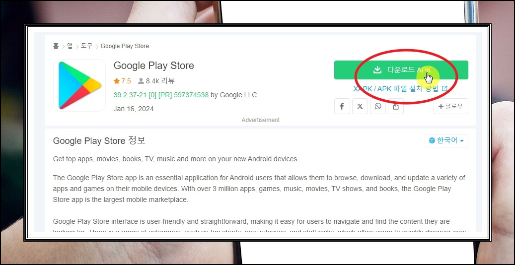 4. 구글 play스토어를 선택했습니다. 또 한번 새로운 페이지가 열리는데요, 여기에서 다운로드 버튼을 찾을 수 있어요. APK 확장자로 된 파일을 다운로드 받게 되는데요, 이 버튼을 클릭해 보겠습니다.