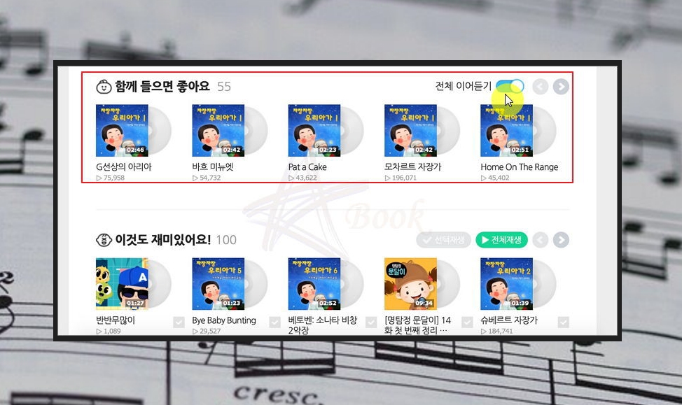 한 곡이 아닌 여러 자장가에 대한 연속듣기 방법을 알려드릴게요. 듣고 있는 곡 아래를 보시면 '함께 들으면 좋아요' 리스트가 나타나요. 거기에서 '전체 이어듣기'를 체크해주시면 됩니다. G선상의 아리아, 바흐 미뉴엣, Pat a Cake Home On The Range를 포함한 55개의 곡을 이어서 연속듣기를 하실 수 있어요.