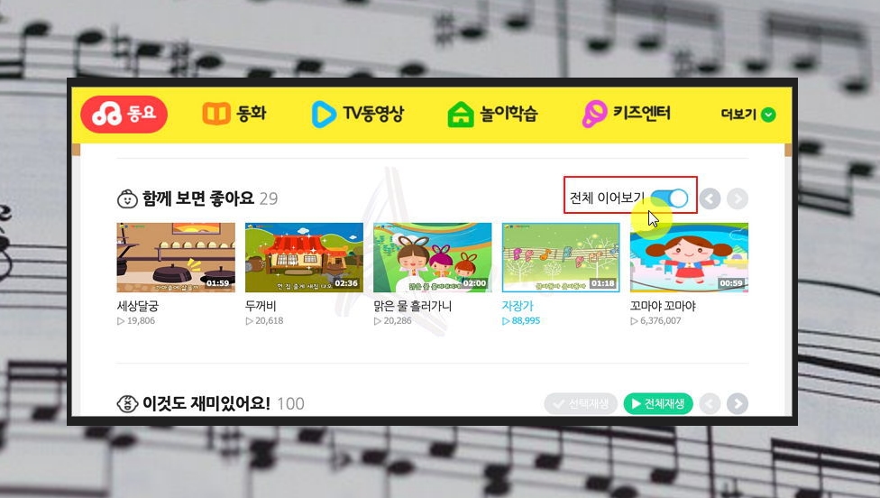 여기서는 연속듣기 기능을 갖추고 있어요. 전체 이어보기를 체크해 놓으면 세상달궁, 두꺼비, 맑은 물 흘러가니, 꼬마야 꼬마야 등의 유익한 컨텐츠를 이용하실 수 있습니다.
