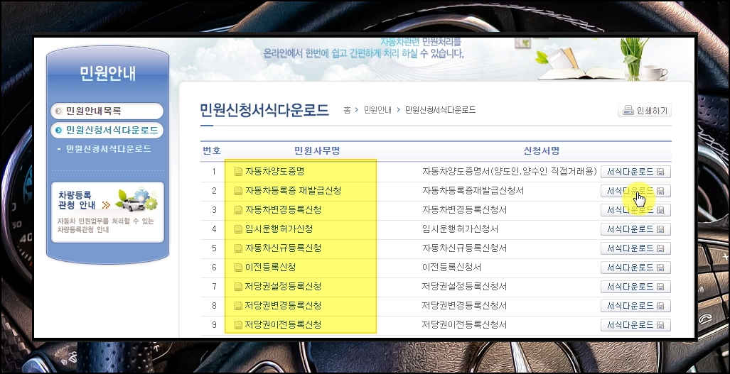 자동차매매계약서 양식 외에도 차량을 매매하거나 새롭게 등록할 때에는 여러 가지 신청서 양식이 필요한데요. 이러한 것들을 공공기관 사이트에서 모두 무료로 다운 받을 수 있습니다. 저당권 이전 및 말소 등록신청서, 차 말소 등록신청서, 구조 및 장치 변경 승인 신청서, 차량 등록사항 경정신청서 등 다양한 양식을 무상으로 내려 받을 수 있죠.