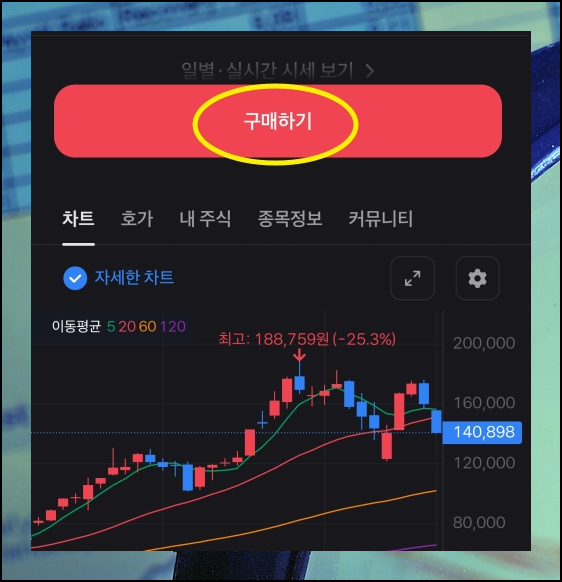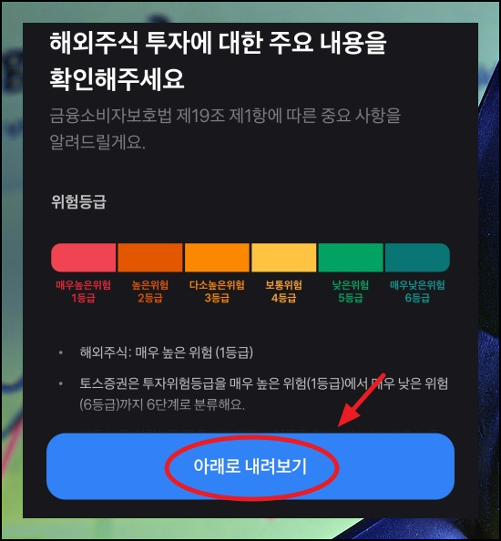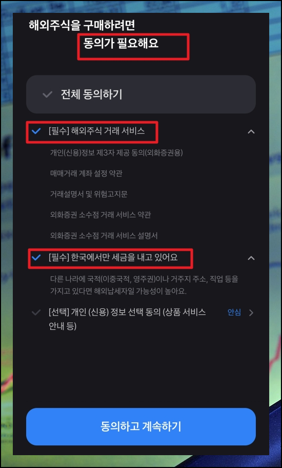 화면이 바뀌면서 우리가 선택한 종목에 대한 차트, 호가, 정보, 커뮤니티와 같은 것을 볼 수 있게 되어 있는데요. 맨 아랫쪽에 보면 "구매하기" 버튼이 있습니다. 해당 버는을 눌러보세요. 해외주식을 처음 사는 경우에는 동의가 필요한데요. 필수 영역에 해당하는 부분만 선택하면 됩니다. 주요 내용도 한 번 확인한 후 자신에게 맞는 투자 방법이 맞는지 확인해 주세요. 이 과정은 해외주식 사는법을 처음 진행할 때에만 나타나고, 그 다음부터는 나오지 않습니다.