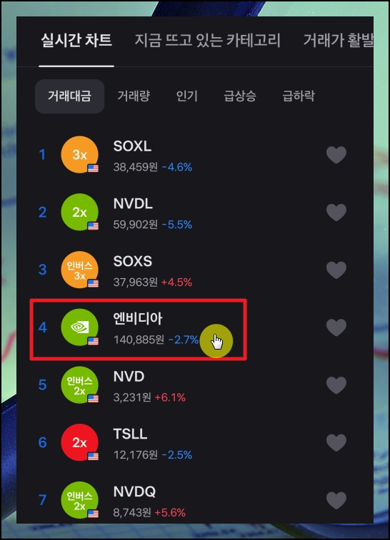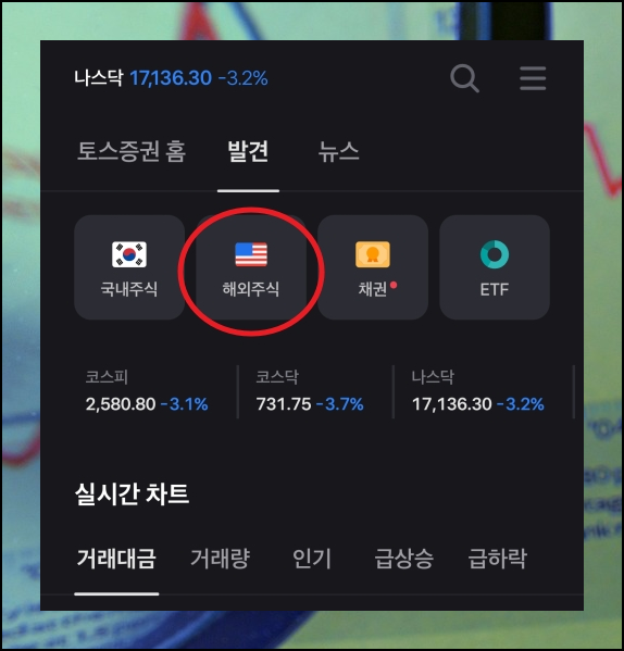[발견] 메뉴를 선택하면 이렇게 국내 및 해외주식, 채권, ETF 메뉴가 나타나고, 그 아래에는 여러 지수에 대한 가격과 실시간 차트가 나타납니다. 여기에서 [해외주식] 메뉴를 선택합니다. 그럼 거래대금, 거래량, 인기, 급상승, 급하락 이렇게 5가지 기준에 따라 여러 가지 종목에 대한 순위를 알아볼 수 있어요. 이렇게 종목을 찾았으니 바로 사는법 설명을 해드리도록 하죠. 리스트에서 사거나 팔고 싶은 종목을 선택합니다.